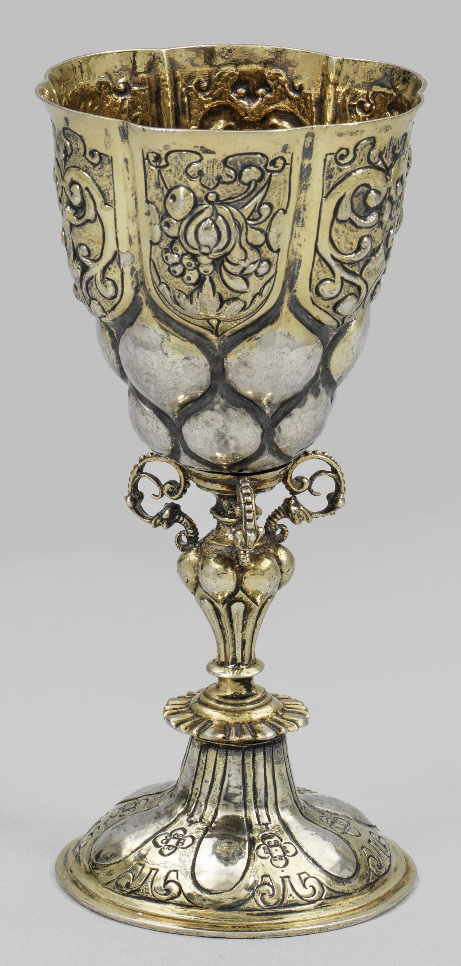 Kleiner Renaissance-Pokal Silber teilvergoldet. Runder gering getreppter Hohlfuß gerahmt von breiten Zungenornamenten im Wechsel mit fein getriebenen und ziselierten Blütenornamenten. Kurzer Balusterschaft mittig dekorativ gearbeitet in Form einer Vase mit drei Voluten als Griffe. Becherförmige Kuppa umlaufend gegliedert durch versetzt angeordnete ellipsenförmige Buckel. Unterhalb des glatten Lippenrandes verziert mit üppigem Voluten- und Fruchtbündeldekor. Innen vergoldet. Gew. ca. 195 g. H. 16 5 cm.