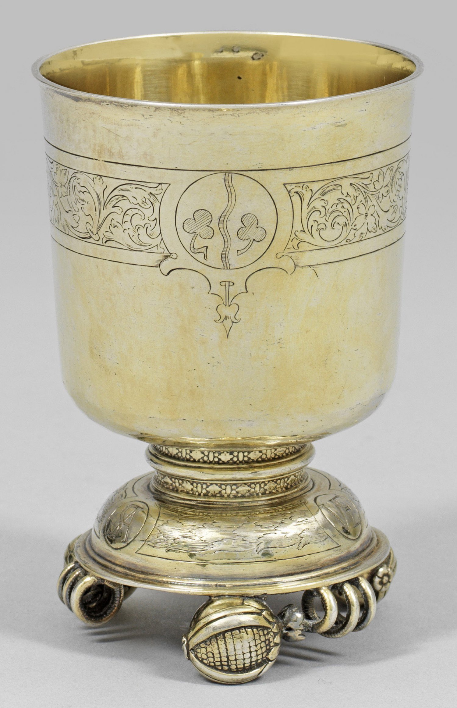 Äußerst seltener Fußbecher Silber, vergoldet. Über drei vollplastisch, reliefierten und naturalistisch gestalteten Granatäpfeln mit spiralförmig gedrehten Stängeln ein runder, aufgewölbter Stand. Umlaufender, fein ziselierter Blätterkranz, drei ovale Reserven rahmend. Darin Monogrammgravuren "VE", "PH" und "SA". Kurzer, von Profillinien gegliederter und mit Ornamentbändern verzierter Schaft, übergehend in gering konische Kuppa mit leicht ausschwingendem Lippenrand. Auf der glatten Wandung umlaufendes Ornamentband mit detailreicher Voluten- und Blattgravur zwischen drei runden Kartuschen mit Initialien "DHT", bez. "1572" sowie einem Wappen mit zwei dreiblättrigen Kleeblättern. Innen vergoldet. Gew. ca. 178 g. H. 11,2 cm.