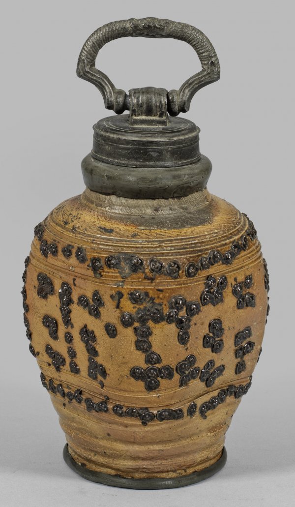 Altenburger Schraubkruke Steinzeug, hellbraun glasiert. Ovoider Korpus, vierseitig abgeplatteter, durch Drehrillen akzentuierter Korpus. Dekor mit dunkelbraunen Beerennuppen. Zinnmontierung mit Schraubverschluss und geschweiftem Griff, undeutl. gem.; H. 21 cm.