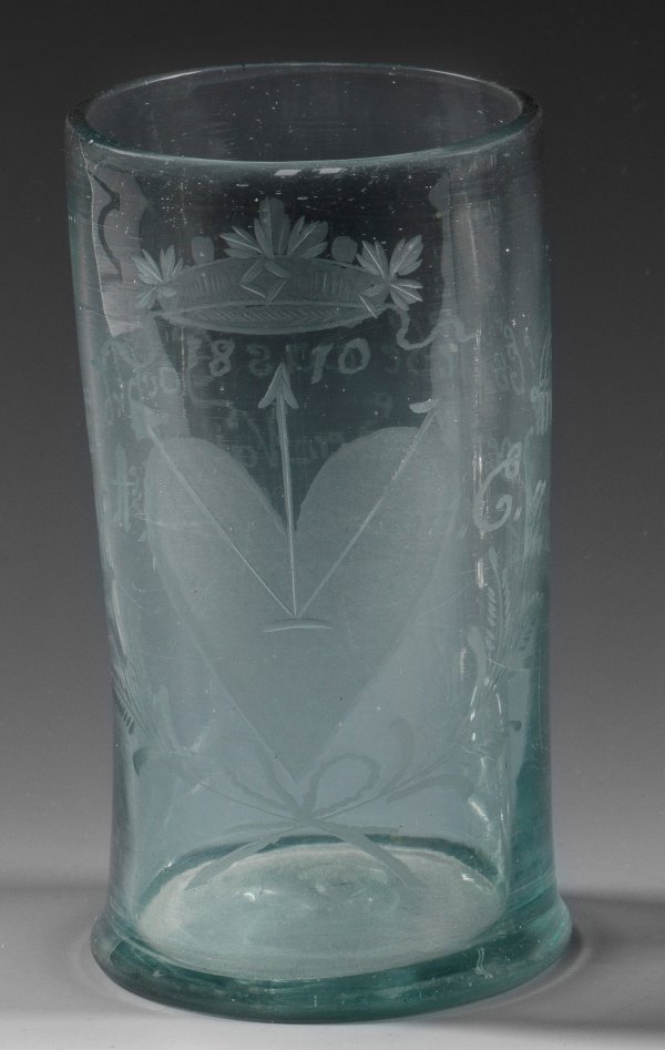 Zunftbecher der Nagelschmiede Farbloses Glas. Zylindrische am Fuß leicht ausgestellte Form. Matt geschnittener Dekor aus dem bekrönten Zunftwappen mit Dat. 1810 und Monogr. rücks. Vivat-Spruch auf die Zunft. H. 15 cm.