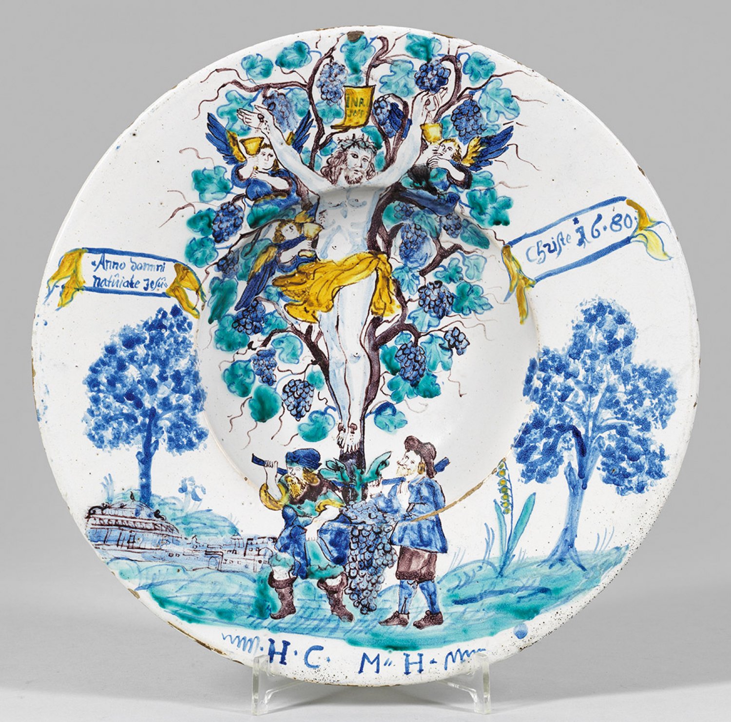 Seltener Habaner Wandteller Fayence. Brauner Scherben, weißgraue Glasur. Gemuldeter Spiegel, breite, leicht ansteigende Fahne. Polychromer Scharffeuerdekor mit szenischer Darstellung in stilisierter Landschaft. Mittig der gekreuzigte Jesus Christus in einem Weinstock, dessen Blut aus den Wundmalen der Hände von zwei Engeln mit goldenen Pokalen aufgefangen wird; unterhalb Josua und Kaleb mit der Traube sowie Monogramme "H. C" und "M. H." am Rand; flankierend zwei Inschriftenbänder "Anno Domini natuiate Jesu Christe 16.80". Verso originale, anmodellierte Aufhängeöse. Sammlungs-Etikett "The Olive Collection Bonhams 29". D. 36 cm.