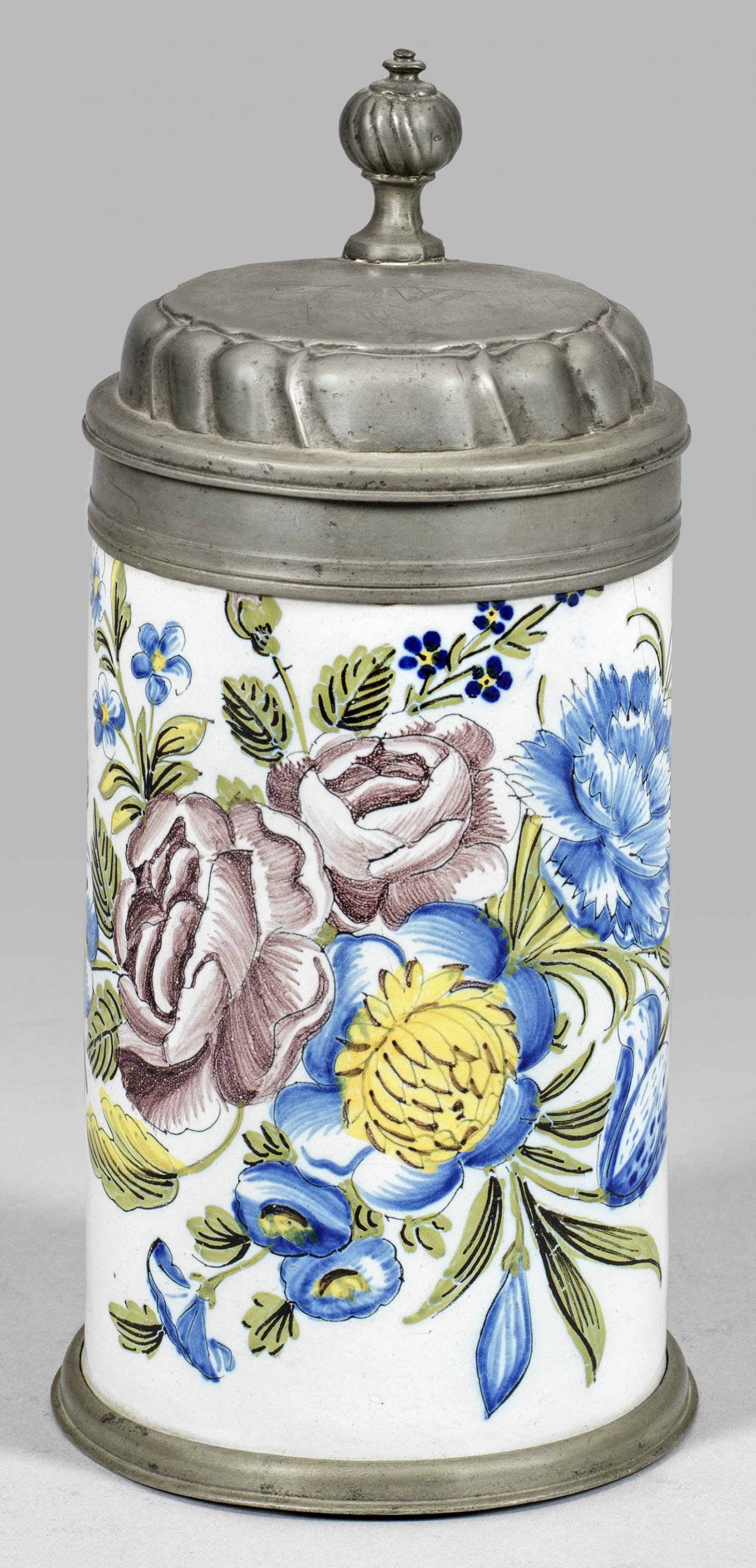 Schrezheimer Walzenkrug Fayence. Dekor aus einem Blumenbukett in polychromer Scharffeuermalerei. Zinnmontierung, im Deckel graviertes Monogr.; H. 23 cm.
