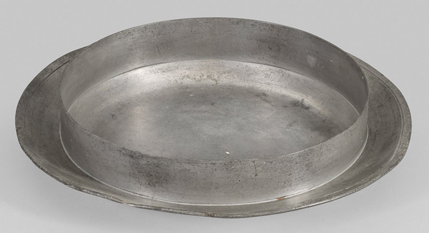 Steinrandschale Zinn. Leicht gemuldeter Korpus mit hoher gerader Wandung und ausgestelltem gering ansteigendem Rand. Unw. Gebrauchsspuren. Gem. Stadtmarke zweifache ligierte Meistermarke. D. 37 cm.