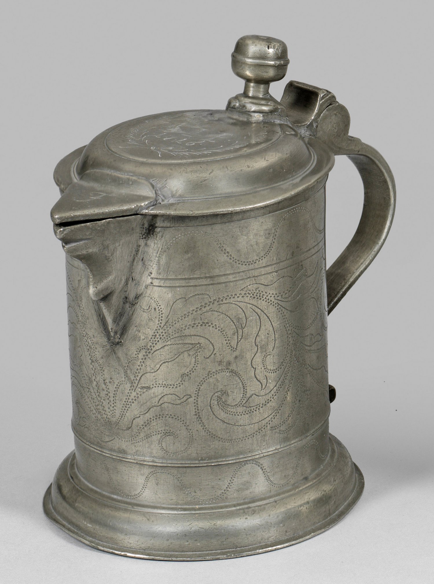 Deckelhumpen Zinn. Über wulstartigem Stand hoher, zylindrischer Korpus mit tief angesetztem Schnabelausguss. Umlaufend verziert mit geflecheltem, floralem und wellenförmigem Ornamentdekor. Gewölbter und scharnierter Deckel mit Ausgussabdeckung und Kugel als Daumenrast. Mittig auf dem Deckel bekränztes Monogramm mit Datum "FIP 1716" sowie "F". Geschwungener Bandhenkel. Rest.; H. 20 cm.