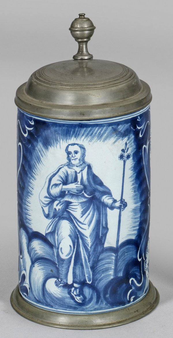 A Nuremberg light blue glazed faience tankard with dark blue decor depicting Moses parting the waters of the Red Sea. Pewter-mounting and lid replaced.