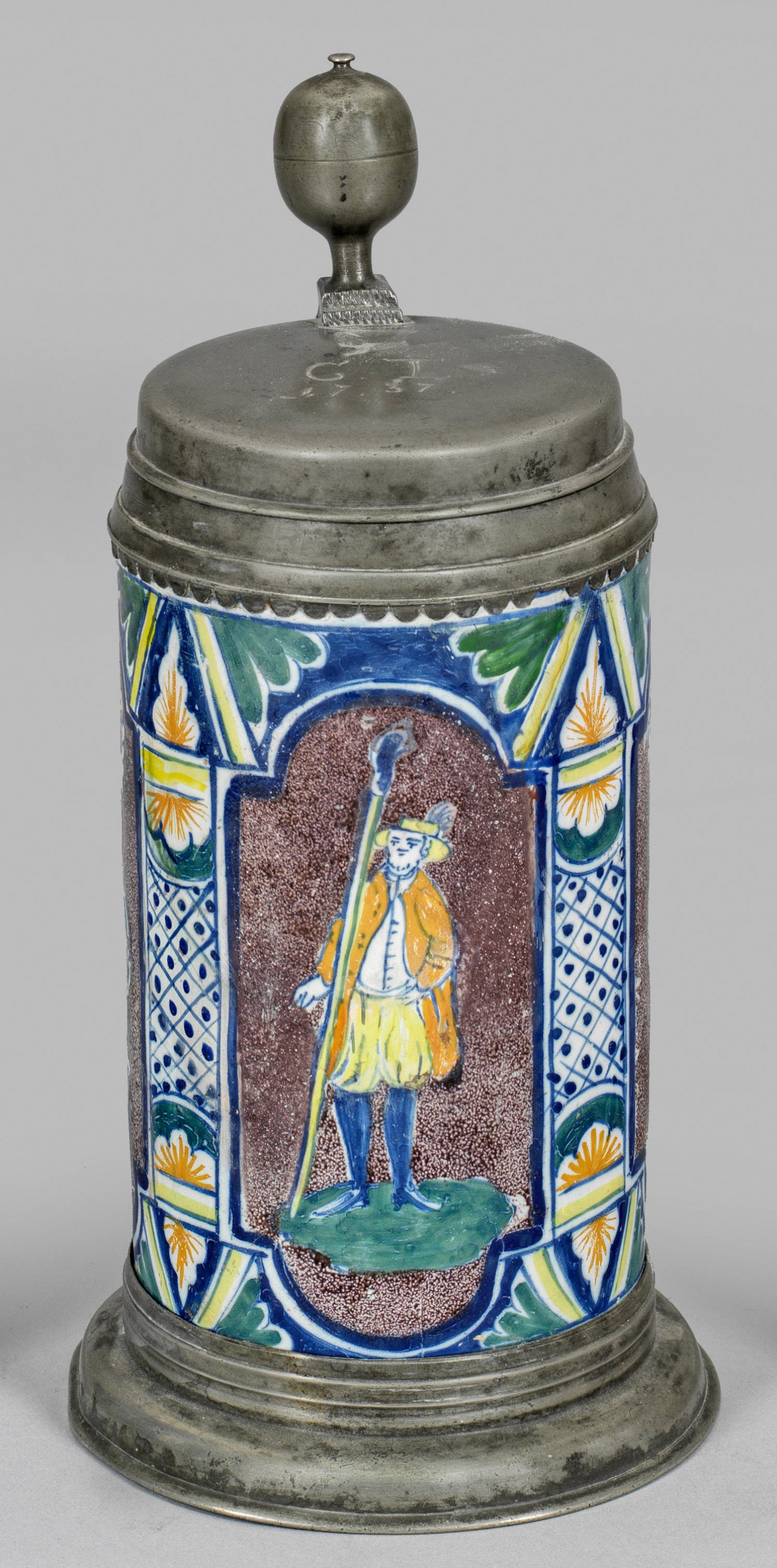 Erfurter Walzenkrug Sog. Pilasterkrug. Manganvioletter jaspierter Fond mit Reserven, in polychromer Scharffeuermalerei Darstellung eines Schäfers in höfischer Tracht, seitlich Blütenstängel. Zinnmontierung, der Deckel mit Kugeldrücker, graviertem Monogr. u. Dat. 1737, gem. (Meistermarke und Stadtmarke von Halle an der Saale). H. 27 cm.