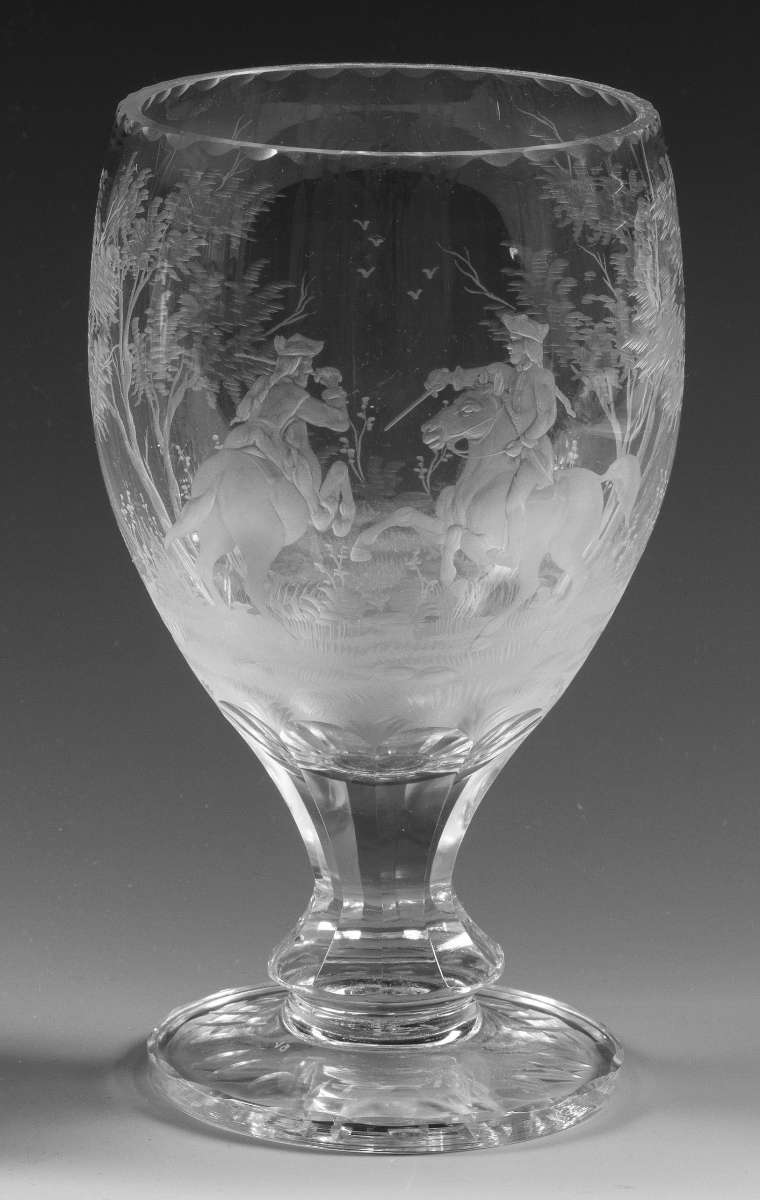 A Bohemian cut glass goblet with engraved decor of a fight between two riders. Manufacturer's monogram.