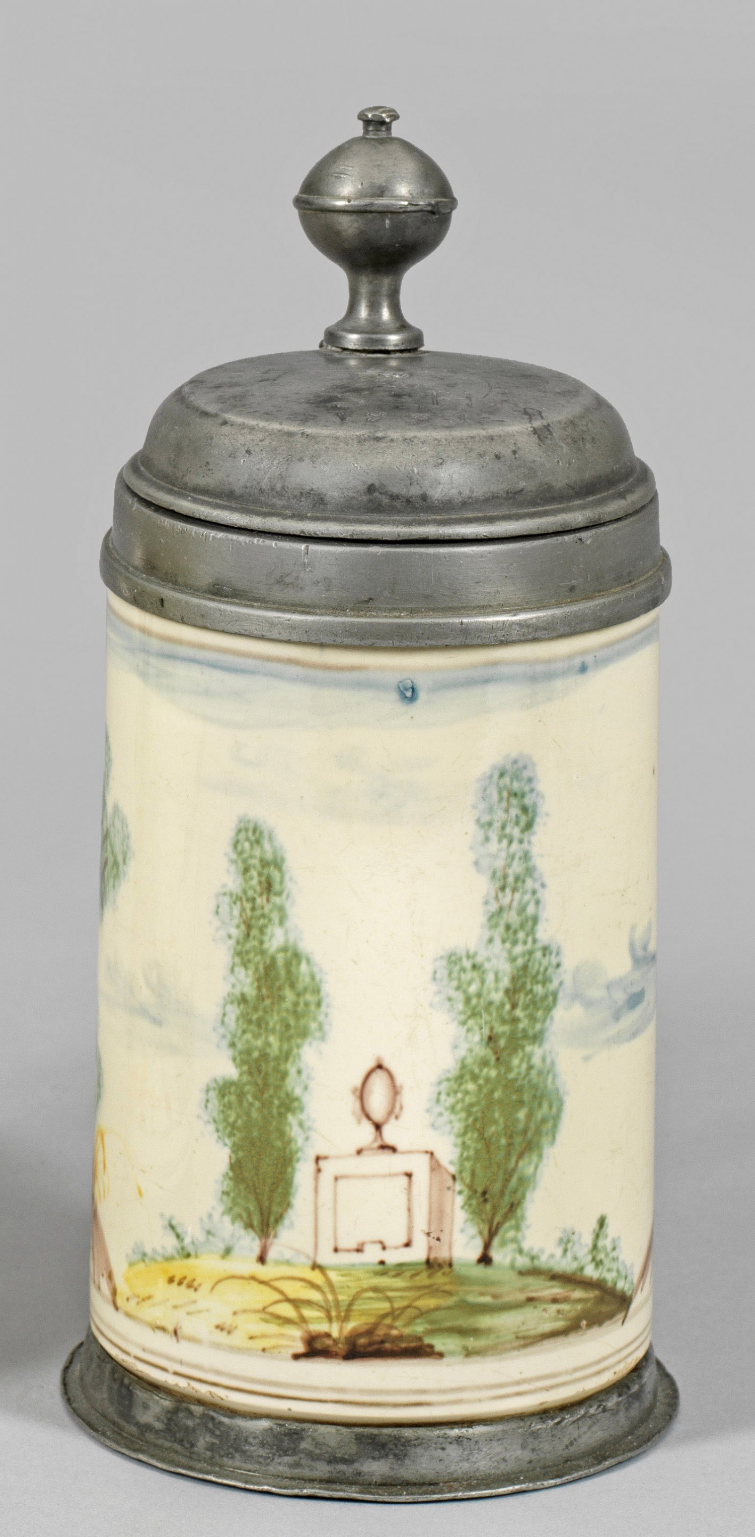 Walzenkrug Steingut. Polychromer Landschaftsdekor. Pressmarke "M" mit Nr.; Zinnmontierter Fuß, der Zinndeckel mit graviertem Monogramm u. Dat. 1801, undeutl. gem.; Bohrung im Deckel. H. 22 cm.