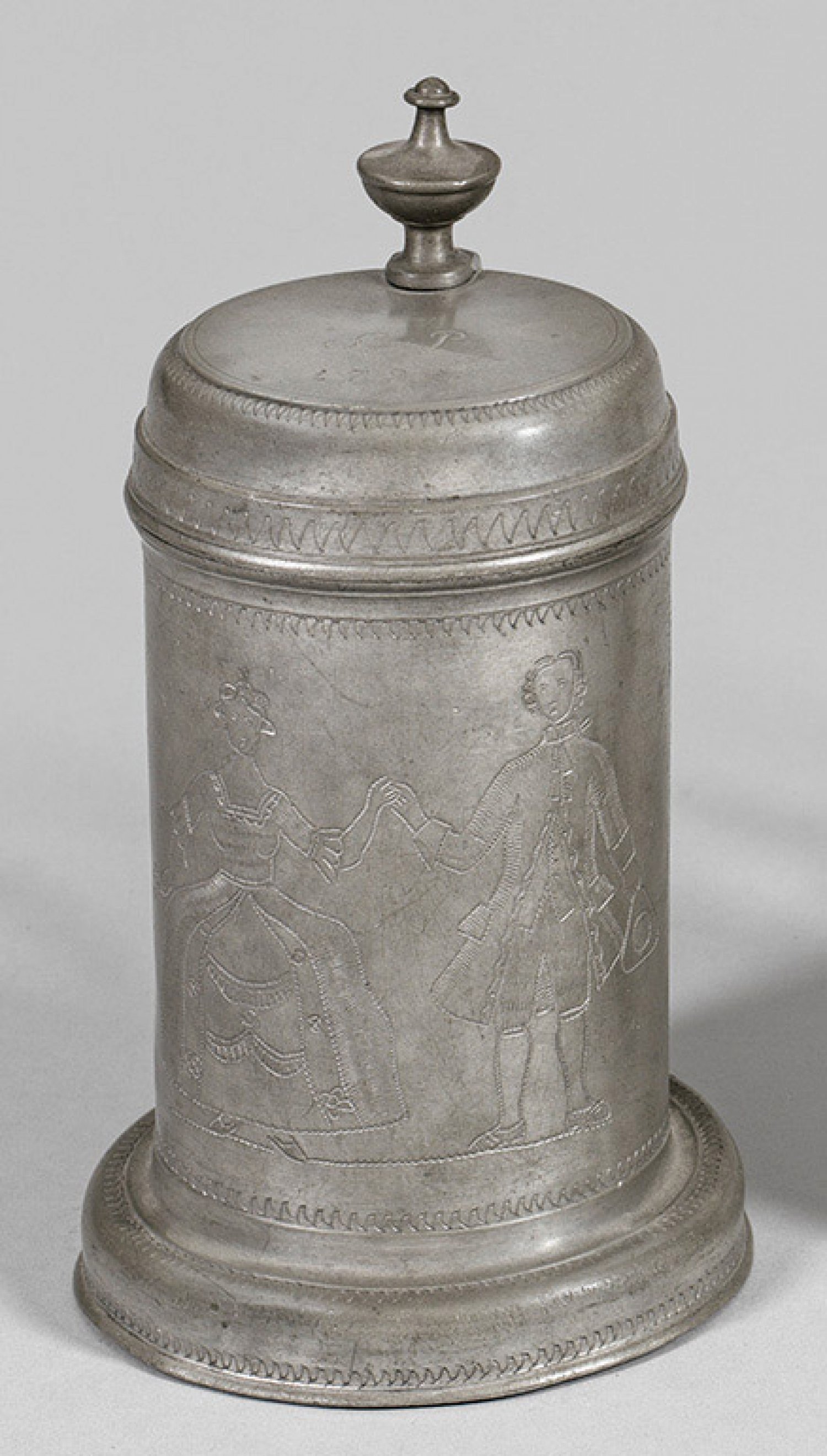 Hochzeitshumpen Zinn. Über gewölbtem Stand zylindrische Wandung. Schauseitig geflechelter Dekor mit Darstellung eines Hochzeitspaares in Rokokotracht seitl. großes Vasenpaar. Auf gewölbtem Deckel monogr. und dat. 1791. Gem. zweifache Stadtmarke Meister Johann Paul Böhmer (wird Meister 1752). H. 23 cm.