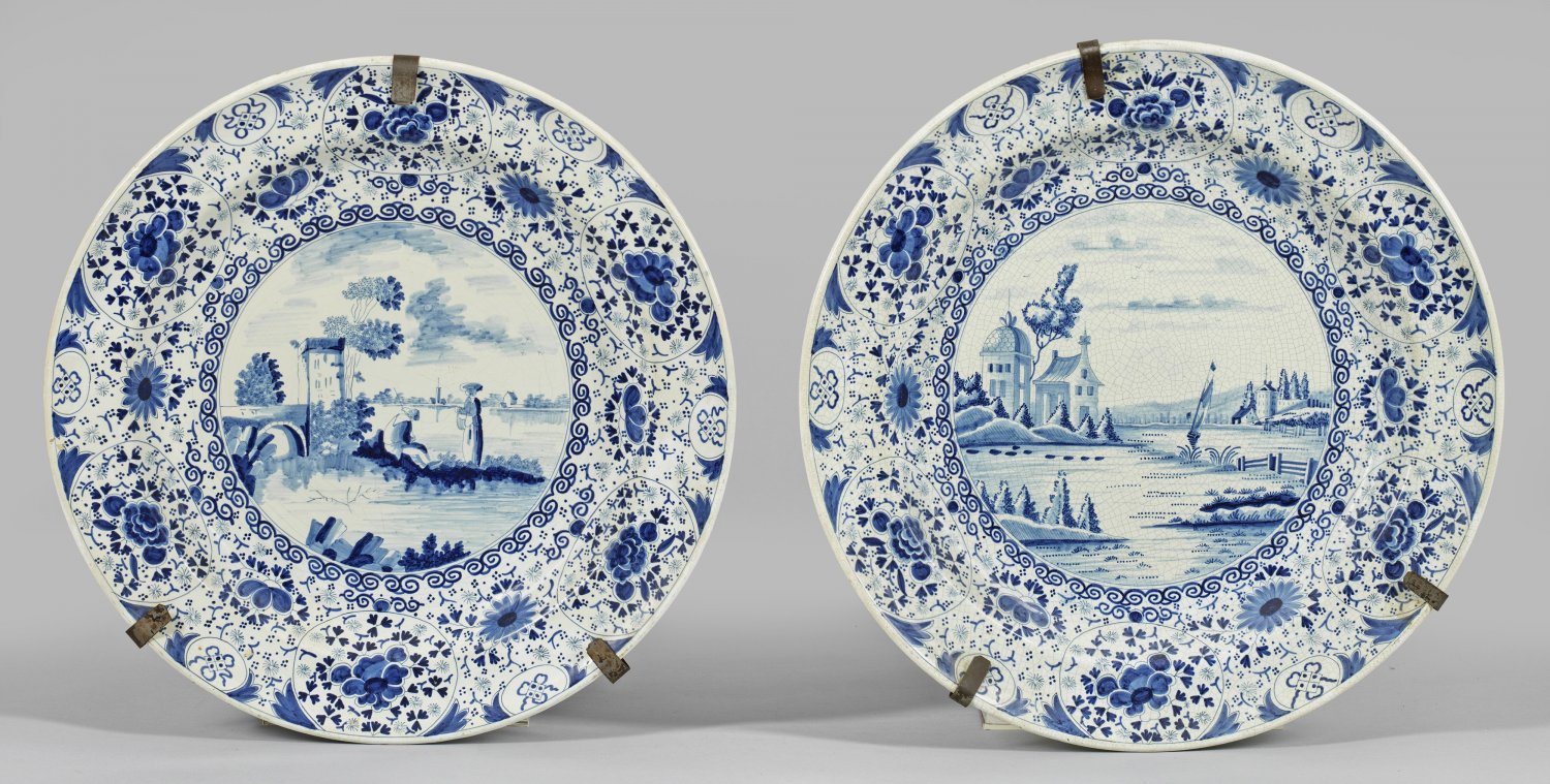 A pair of large Dutch blue and white faience wall plates with landscapes. Marked.