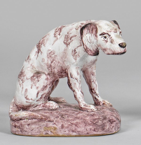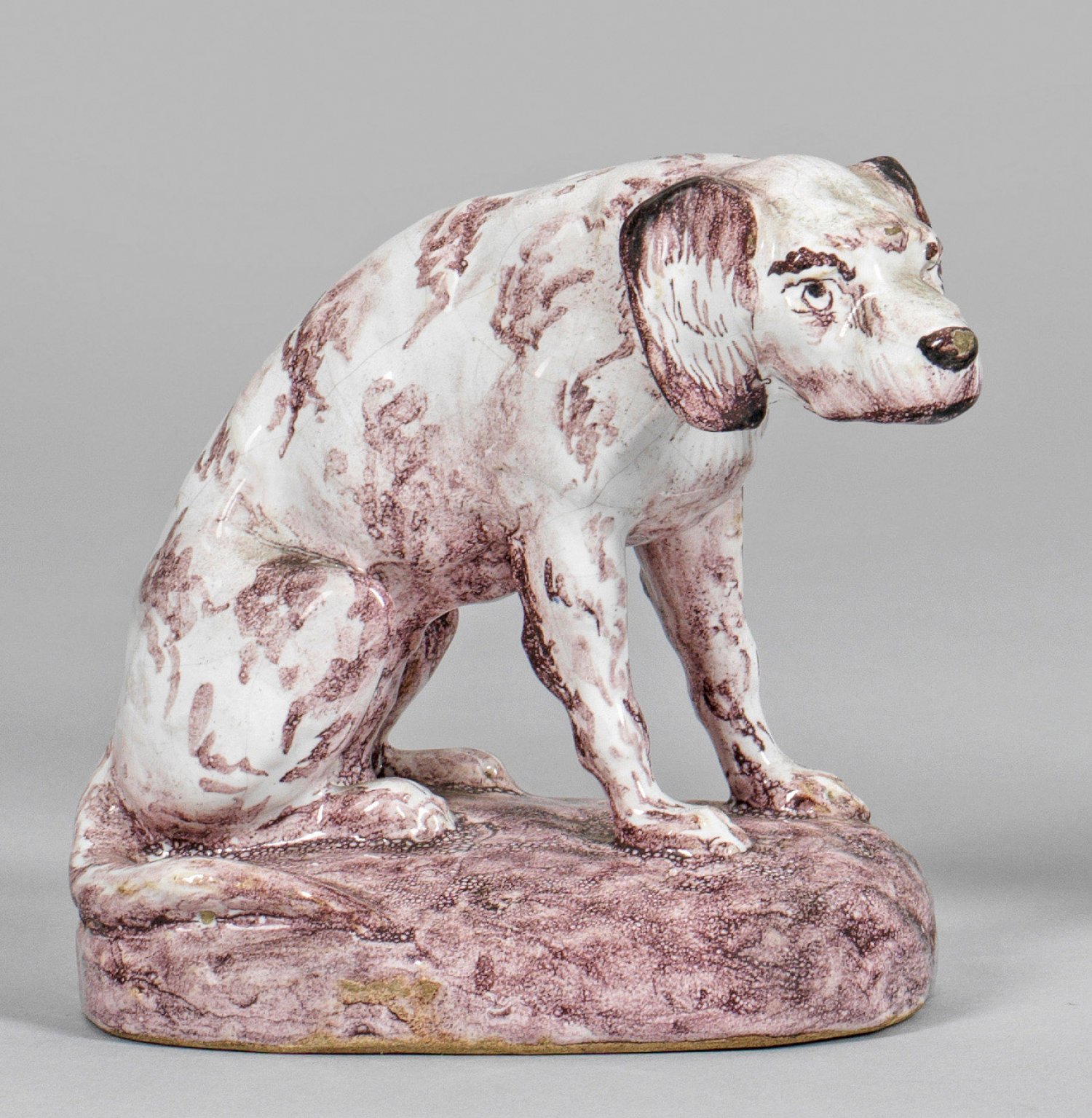 Sitzender Jagdhund Fayence. Vollplastische Darstellung auf länglich-ovaler Plinthe. Bemalung in Manganviolett. Ein Ohr minim. best.; H. 11,5 cm.