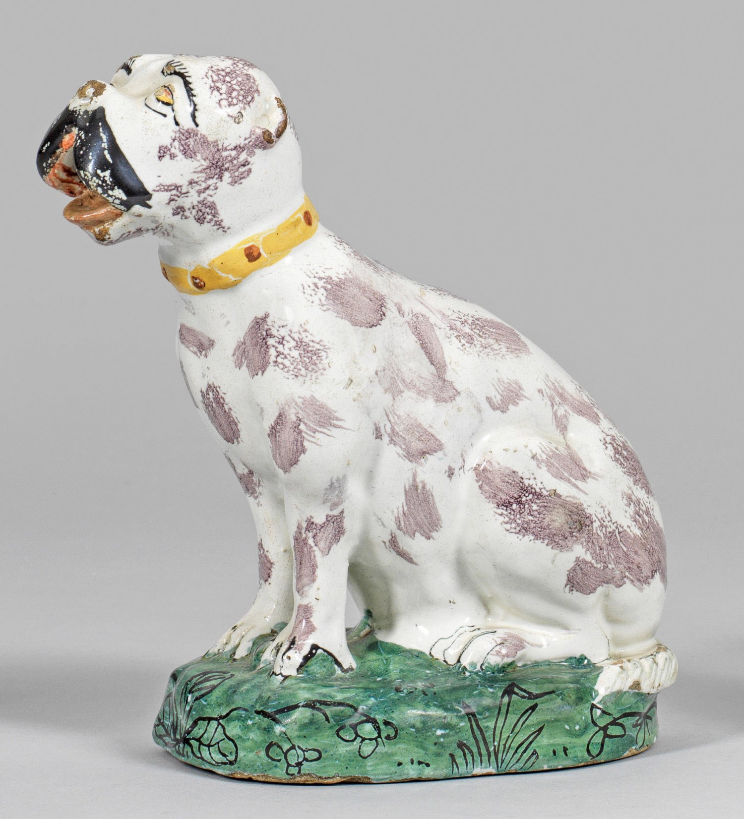 Sitzender Mops Fayence. Vollplastische Darstellung auf länglich-ovaler Plinthe. Polychrome Bemalung. Ger. rest. Glasurbereibungen. H. 20 5 cm.