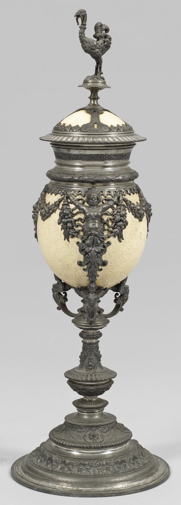 Trompetenförmiger, mehrfach gegliederter Fuß mit balusterförmigem Schaft und reliefierten Nodi. Umlaufend Verzierungen mit Blatt- und Blütenranken sowie Akanthusblattdekor. Die Kuppa bestehend aus einem Straußenei, gefasst von durchbrochen gearbeiteten, reliefplastischen Festons aus Fruchtbündeln, gehalten von drei Frauenfiguren. Spitze des Eies als Deckel mit blattverzierter Zinnmontierung. Bekrönung in Gestalt eines vollplastisch gestalteten Straußes, ein Hufeisen im Schnabel tragend. Fuß des Pokals mit unleserlicher Widmung und Datum. Knauf besch.; H. 55 cm.