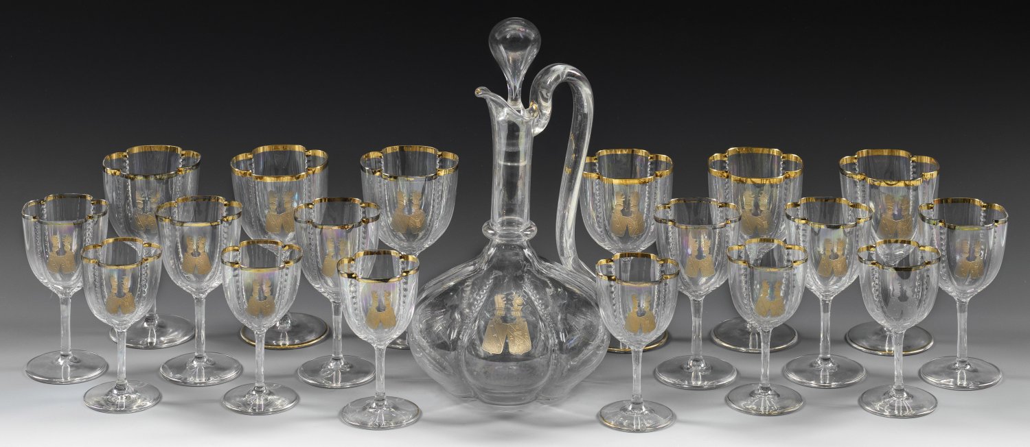 Trinkglasservice mit Allianzwappen für 6 Personen 19-tlg.; Farbloses, leicht lüstrierendes Glas. Im venezianischen Renaissance-Stil gestaltete Formen. Karaffe mit stark gebauchtem, sechspassigem Korpus, perlschnurartig akzentuierten Rippen, langem Enghals, hohem Ohrenhenkel und tropfenförmigem Stöpsel; 18 Weingläser als Sätze in drei unterschiedlichen Größen mit vierpassiger Kuppa und korrespondierend gestalteten Rippen. Schauseitig jeweils ein matt geschnittenes und vergoldetes Allianzwappen. Goldgerändert. H. 11 cm-27 cm.