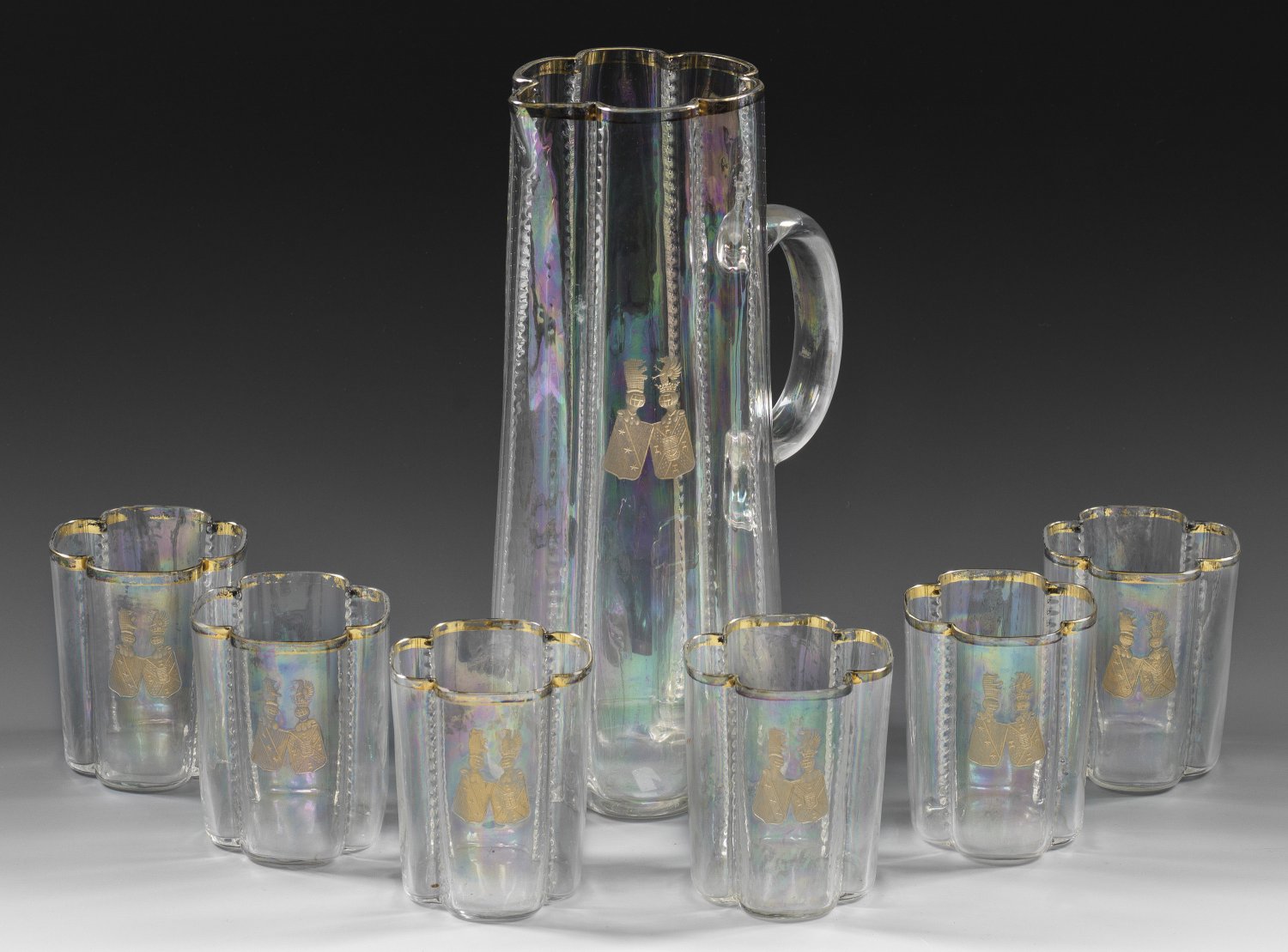 Schenkkanne und sechs Wassergläser mit Allianzwappen Farbloses leicht lüstrierendes Glas. Im venezianischem Renaissance-Stil gestaltete Formen. Leicht konische schlanke Kanne mit sechspassigem Korpus und perlschnurartig akzentuierten Rippen. Die Gläser mit vierpassigem Querschnitt und korrespondierend gestalteten Rippen. Schauseitig jeweils ein matt geschnittenes und vergoldetes Allianzwappen. Goldgerändert. H. 9 cm-27 5 cm.