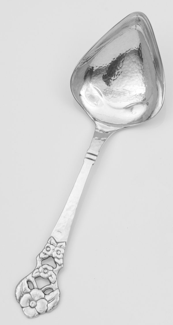 Großer Vorlegelöffel Silber. Spitz zulaufende Laffe und flacher Griff mit feinem Hammerschlagdekor. Durchbrochen gearbeitetes reliefiertes Heft mit Blütendekor. Gest. Stadtmarke Beschau C. F. Heise Herstellerzeichen. Gew. ca. 110 g. L. 25 cm.