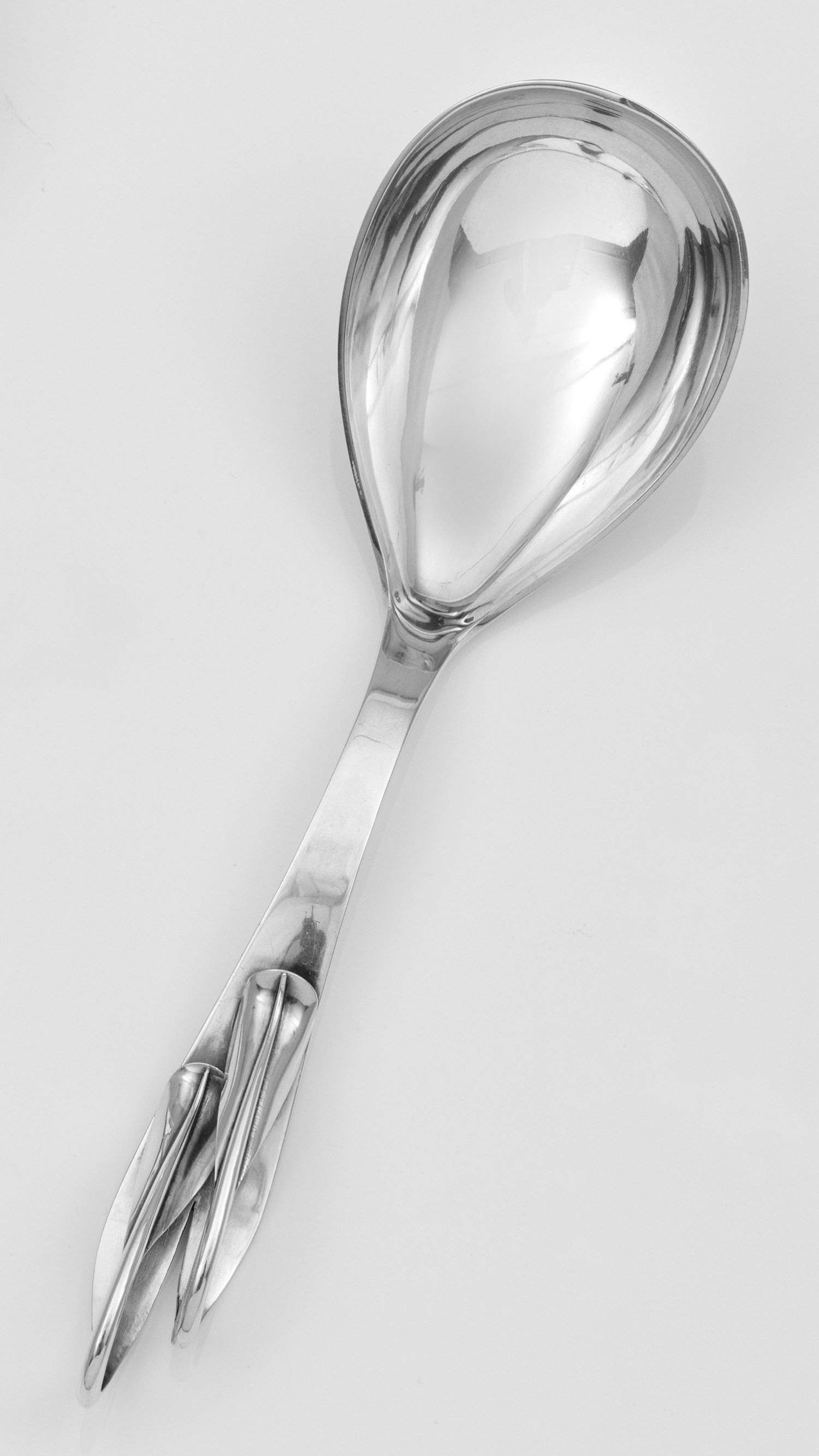 Seltener Hans Hansen-Vorlegelöffel Silber. Tief gemuldete tropfenförmige Laffe. Flacher sich verbreiternder Griff mit zweiteilig in Form von Blütenblättern auslaufendem Heft. Entw. Karl Gustav Hansen. Gest. 925 Herstellermarke Jahresstempel 1935. Gew. ca. 130 g. L. 23 2 cm.