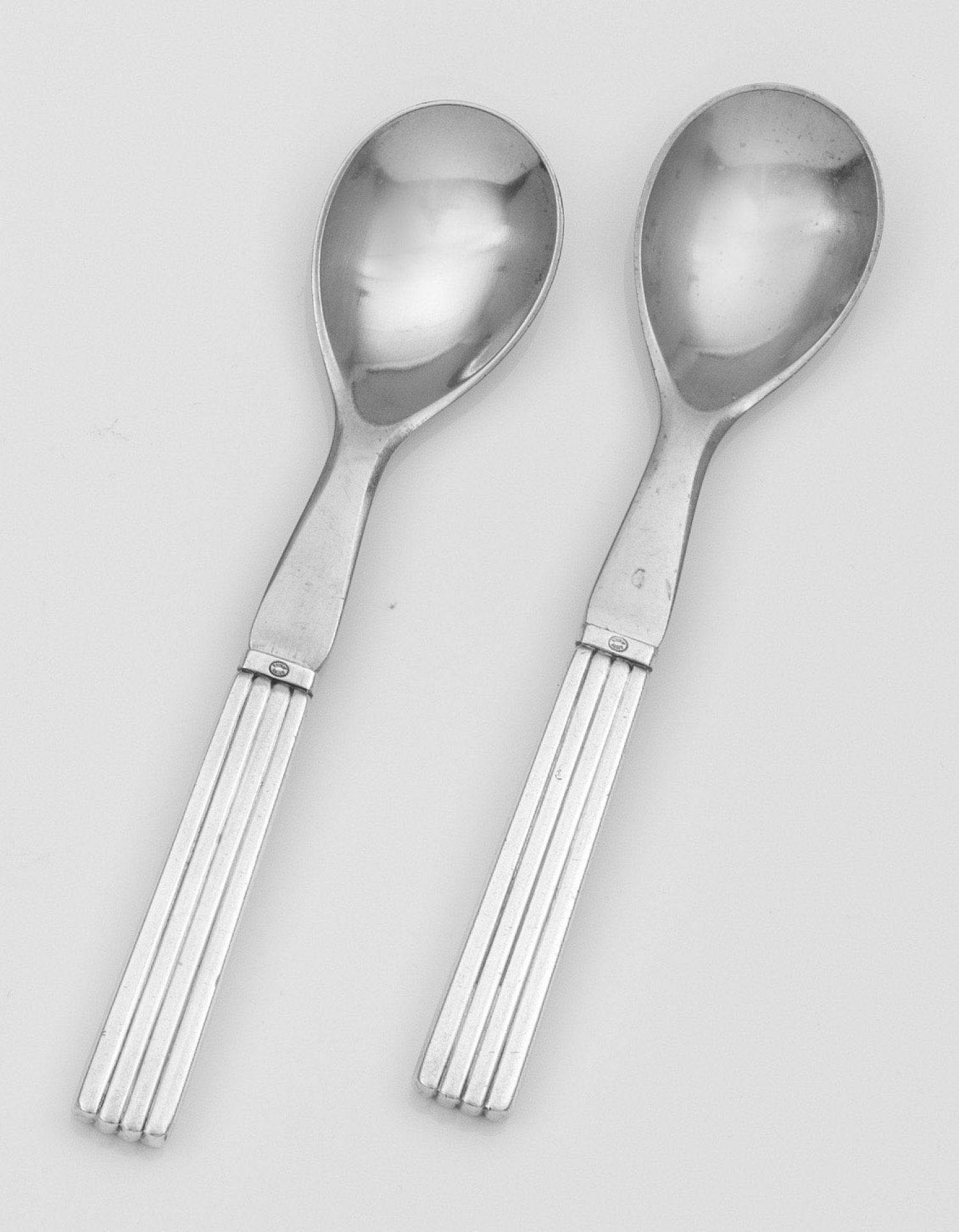 Paar seltene Eierlöffel "Bernadotte" Gering konischer, kannelierter Griff, übergehend in ovale Laffe aus Edelstahl. Dekor "Bernadotte". Entw. Sigvard Bernadotte, 1939. Gest. Sterling, Herstellerzeichen. Gew. zus. ca. 60 g. L. 11,5 cm.