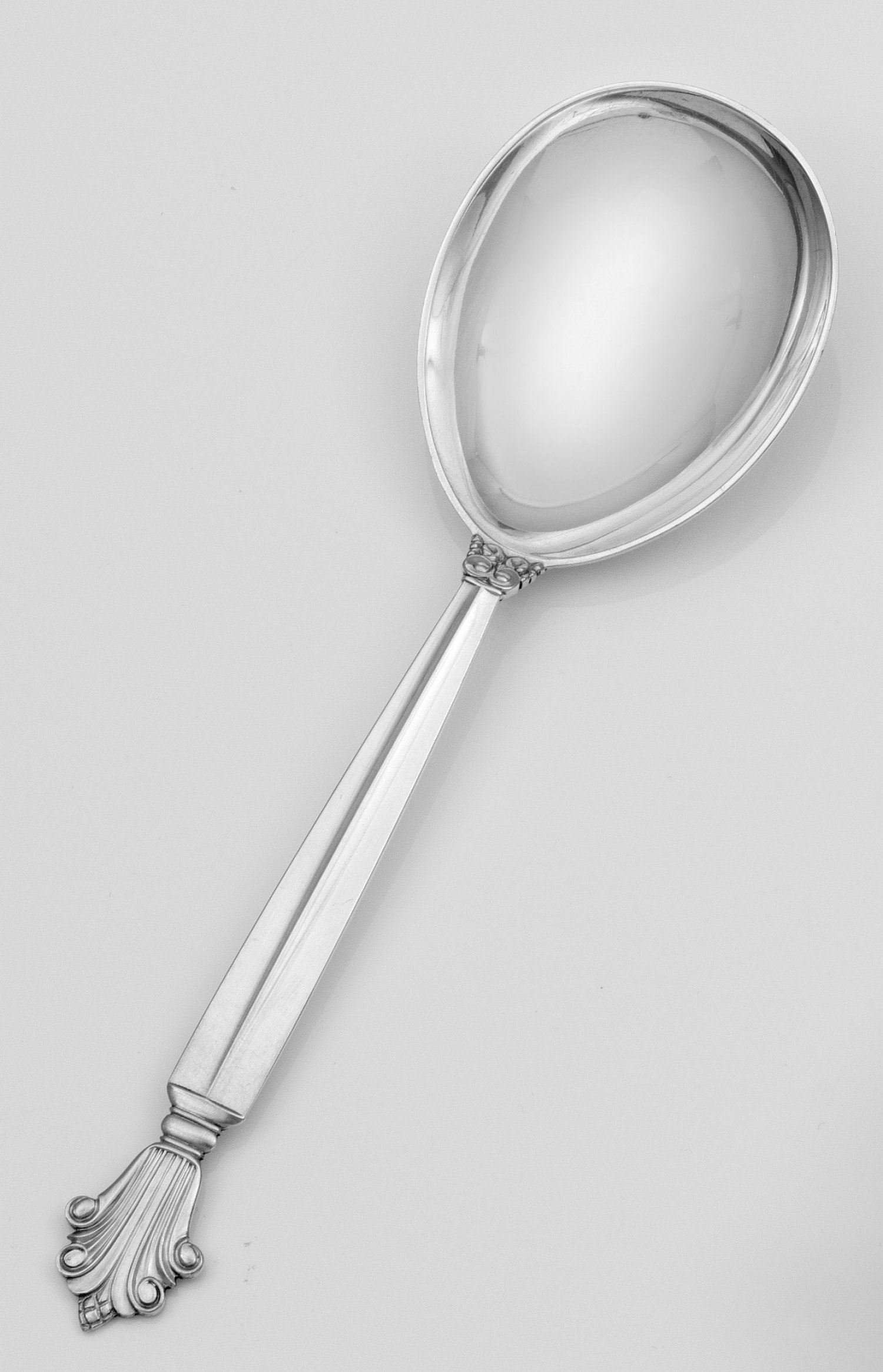 Gemüselöffel "Acorn" Silber. Ovoide Laffe. Vom reliefplastischen Ansatz in Form von Blütenknospen übergehend in sich konisch erweiternden, kannelierten Griff mit Knospenbekrönung. Modell "Acorn". Entw. Johan Rohde, 1915. Gest. 925, Herstellerzeichen. Gew. ca. 73 g. L. 21 cm.