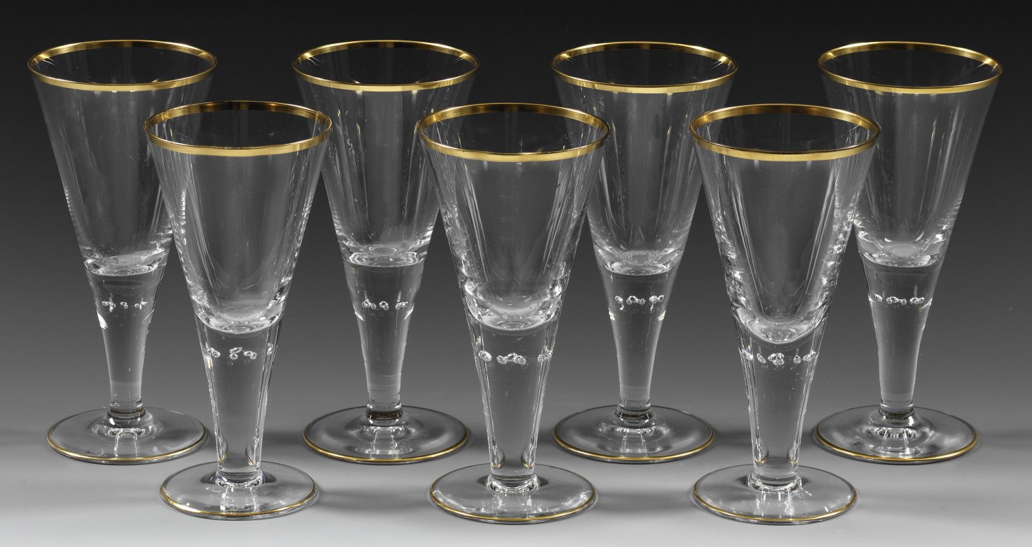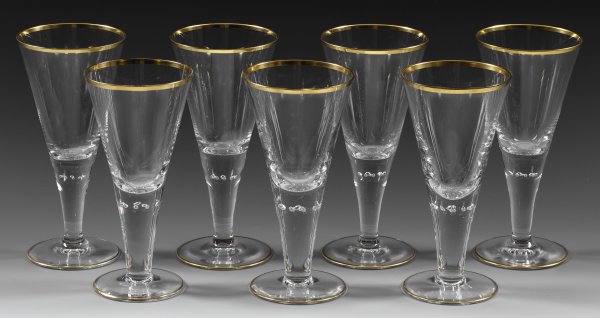 Sieben Spitzkelchpokale Farbloses Glas. Massiver konischer Schaft in geweitete Kuppa übergehend Schaft mit Rosette aus neun kleinen eingestochenen Luftblasen. Goldgerändert. Entw. Arthur Gerlach. Aus dem Service Form 1003. H. 18cm-19 cm.