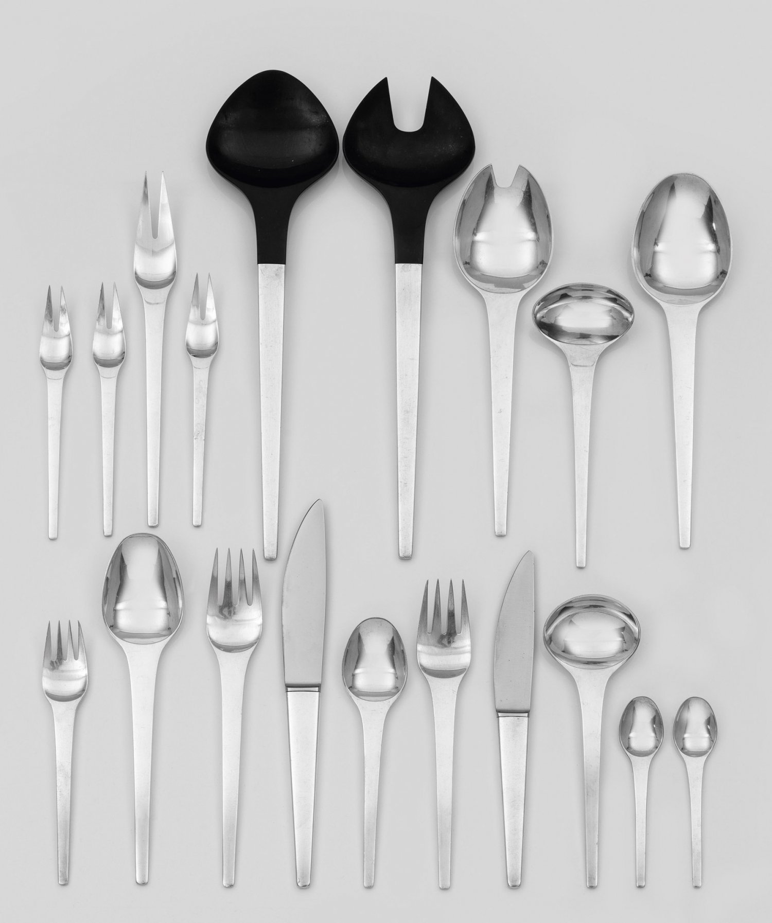 Georg Jensen Speisebesteck "Caravel" für 6 Personen 61-tlg.; Silber. 6 Speisemesser, 6 -gabeln, 6 Menümesser, 6 -gabeln, 6 Suppen-, 6 Bouillon-, 5 Dessertlöffel, 6 -gabeln, 2-tlg. Salatbesteck, Saucenkelle, 4 Fleischgabeln unterschiedlicher Größe, Vorlegelöffel, -gabel, 3 Hummergabeln und 2 Mokkalöffel. Breite, abgeflachte Klinge bzw. Zinken, übergehend in flachen, konischen Griff. Modell Caravel. Entw. Henning Koppel, 1957. Minim. altersgemäße Gebrauchsspuren. Gest. Sterling, Herstellerzeichen. Gew. zus. ca. 4057 g (Gew. ohne gefüllte Teile ca. 2350 g).