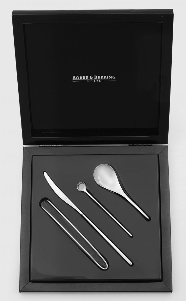 Gourmetbesteck Plated. Im originalen Besteckkasten. 4-tlg.; Messer, Pinzette, großer und kleiner Löffel. Puristisch schlichte und elegante Form. Modell "Edo 150". Entw. Bibs Hosak-Robb, 1984. Gem., Herstellerzeichen. Gew. zus. ca. 129 g.