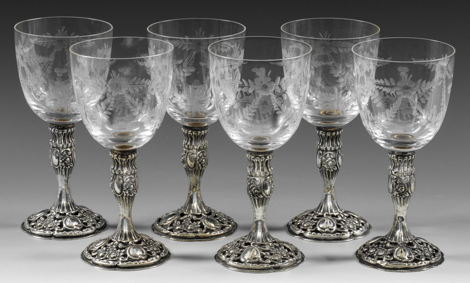 Satz von sechs Weißweingläsern mit Silberfuß und -schaft Partiell durchbrochen gearbeiteter Fuß und Balusterschaft mit Rocaillen- und Rosendekor gest. 835 Herstellerzeichen. Die ovoide Kuppa aus farblosem Kristallglas mit Dekor aus geschnittenen und teilw. geblänkten Blütenfestons. H. 14 8 cm.