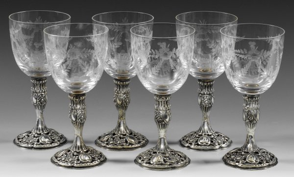 A set of six engraved white wine glasses with silver feet and stems. Standard mark (835) and maker's mark.