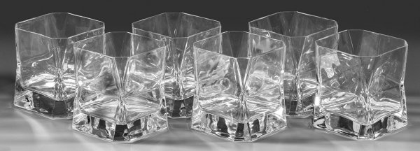 Farbloses Kristallglas, geschliffen. Quadratische, mittig taillierte, an den Ecken x-förmig abgeschrägte Gläser. Entw. Cini Boeri, 1973. H. 9,5 cm.