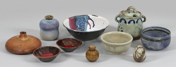 Kleine Sammlung moderner deutscher Studiokeramik 10-tlg.; Verschiedene Formen, Techniken und Glasuren. Irdenware und Steinzeug. U. a. zwei Schalen von Hermann Karl Hakenjos. Größtenteils gem. bzw. sign.; H. 5,5 cm-12,5 cm; Schalen D. 9,5 cm-18 cm.