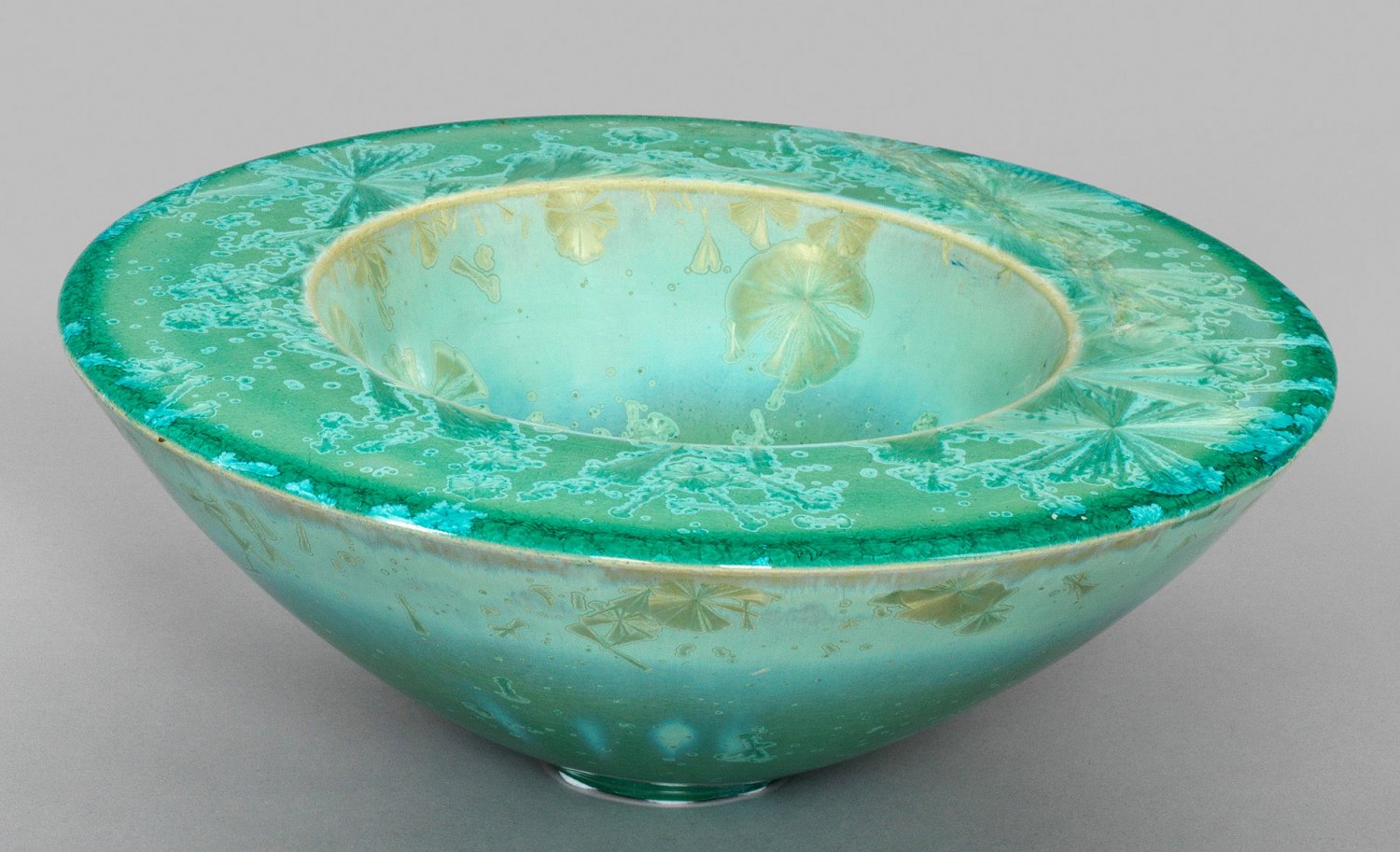 Große konische Schale mit Kristallglasur von Ayca Riedinger Unikatobjekt. Keramik. Runde, konische, tief gemuldete Form mit breit abgesetztem, flachem Rand. Flächendeckende Kristallglasur mit ausgeprägten "Eisblumen" und kristallinen Strukturen in hell- bis smaragdgrünen, türkisfarbenen und Perlmuttertönen. Entw. und Ausführung Ayca Riedinger. Eingepresste Werkstattmarke. D. 36 cm. Innen-D. 21 cm.
