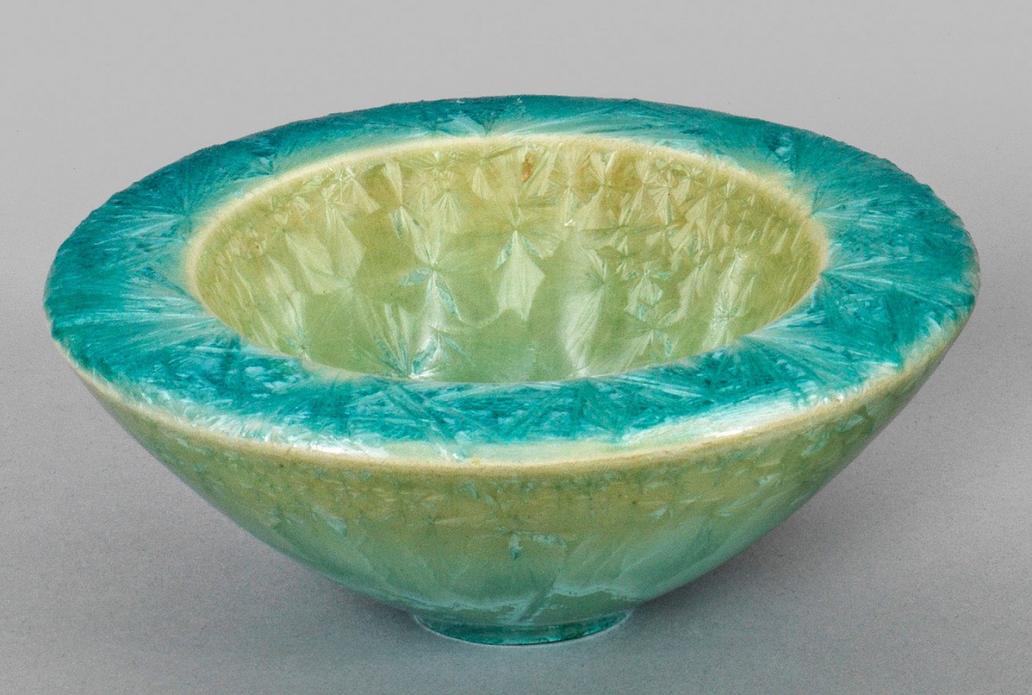 Kleine konische Schale mit Kristallglasur von Ayca Riedinger Unikatobjekt. Keramik. Tief gemuldete konische Form mit flachem Rand. Flächendeckende Kristallglasur in seladon- bis smaragdgrünen türkisfarbenen und Perlmuttertönen. Entw. und Ausführung Ayca Riedinger. Eingepresste Werkstattmarke. D. 13 5 cm. Innen-D. 9 cm.
