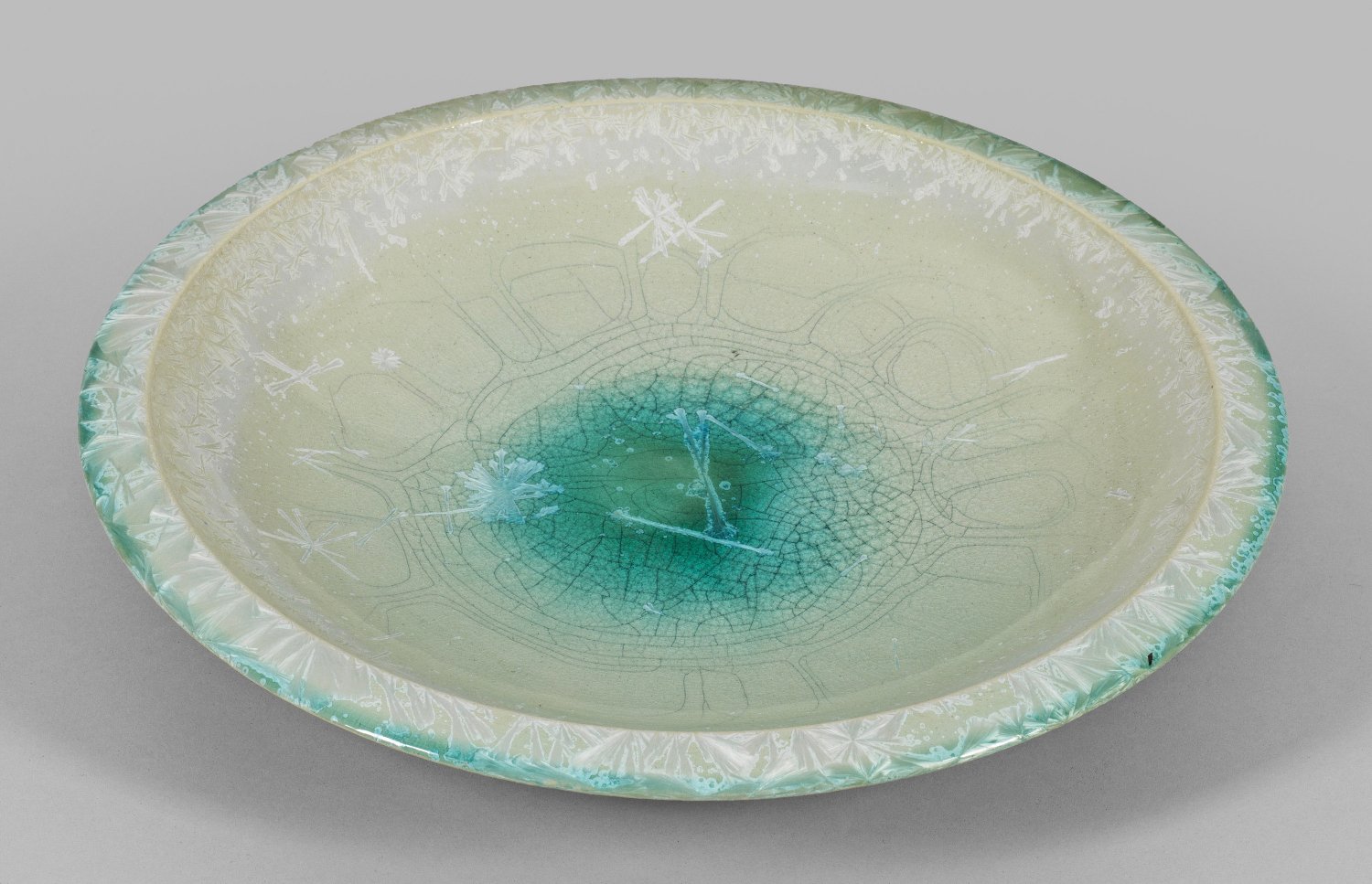 Große Schale mit Kristallglasur von Ayca Riedinger Unikatobjekt. Keramik. Runde, flach gemuldete Form mit breitem, überkragendem Rand. Flächendeckende Kristallglasur mit ausgeprägten "Eisblumen" und kristallinen Strukturen in hellgrünen, türkisfarbenen und Perlmuttertönen. Entw. und Ausführung Ayca Riedinger. Eingepresste Werkstattmarke. D. 45 cm.