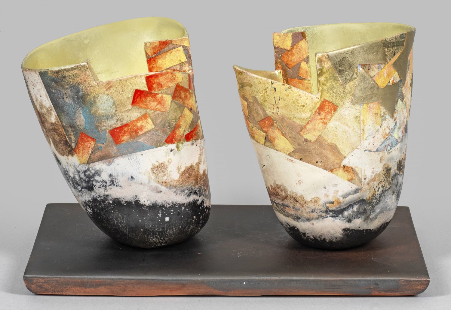 Paar Ziergefäße mit Sockel von Bennet Bean Irdenware. Ovoide, ins Oval gedrückte, asymmetrische Formen mit teilw. ausgeschnittenen, innen zu Stegen montierten Rändern. In Raku-Technik gebrannt, abstrakt bemalt, innen vergoldet. Frei arrangierbar auf einem Sockel aus dunkel gefasstem Gips. H. ca. 16,2 cm-17 cm; Sockel 30 cm x 17,5 cm.