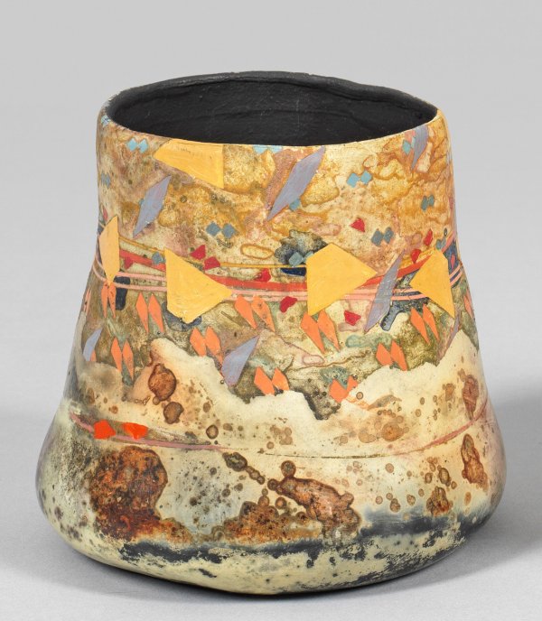 Ziergefäß von Benett Bean Irdenware. Sich verjüngende Becherform. In Raku-Technik gebrannt abstrakt bemalt innen schwarz engobiert. H. 10 5 cm.