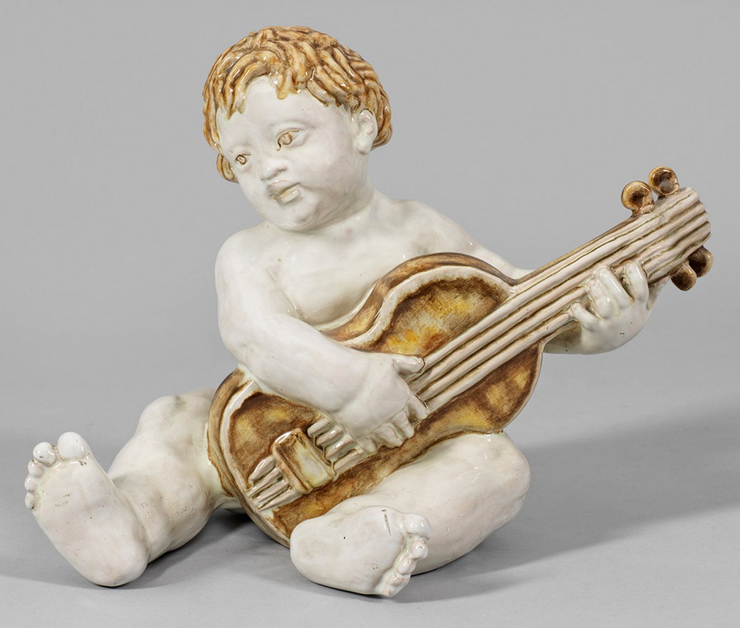 Musizierender Putto von Joseph Wackerle Sitzender Putto mit einem Saiteninstrument. Irdenware bzw. Fayence mit cremefarbener Glasur und brauner Malerei. Entw. Joseph Wackerle. Modell-Nr. 1186. Manufakturmarke. H. 24 7 cm.