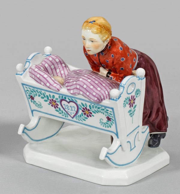 Über profilierter achteckiger Plinthe, angelehnt an eine Wiege mit schlafendem Kind stehendes Mädchen. Naturalistische Ausformung. Polychrome Aufglasurmalerei. Entw. Konrad Hentschel, 1905. Modell-Nr. 73377. Schwertermarke. H. 14,5 cm.