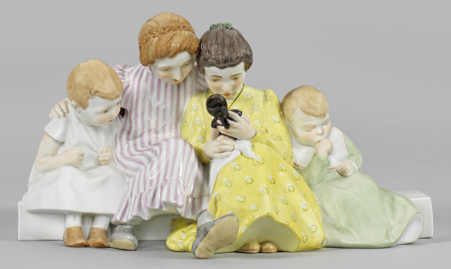 Sitzende Gruppe von zwei älteren Mädchen in gelbem, gepunktetem bzw. rosafarben gestreiftem Kleid, eine Puppe betrachtend. Flankierend ein jüngeres und ein eingeschlafenes Kleinkind in mintgrünem Kleid. Polychrome Aufglasurmalerei. Naturalistische Ausformung. Entw. Konrad Hentschel, 1906. Modell-Nr. 73373. Schwertermarke. H. 14 cm. 25 cm x 13,5 cm.
