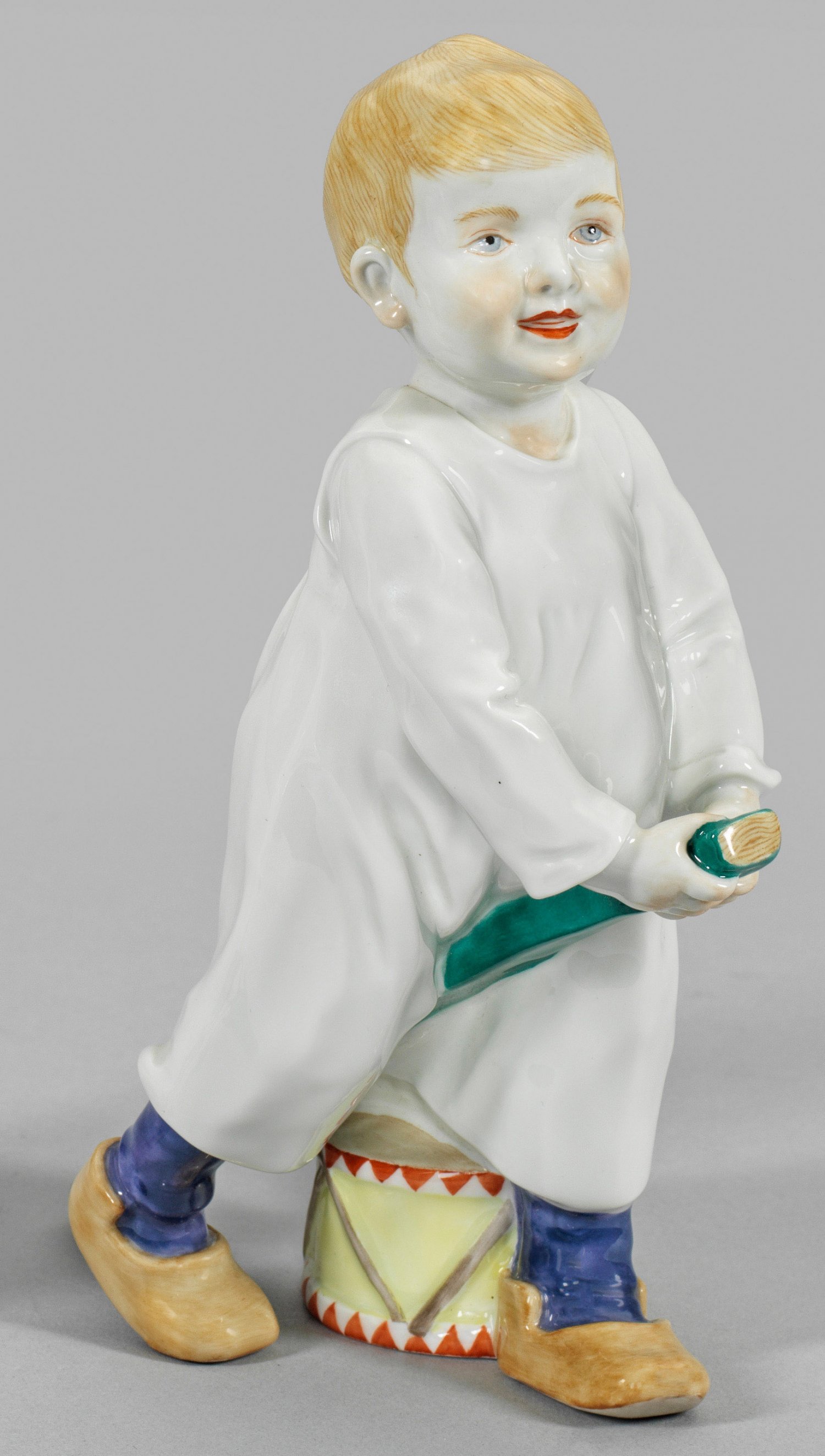 Mit einem grünen Stecken laufender, kleiner Junge in langem, weißem Hemd, blauen Strümpfen und bräunlichen Pantoffeln. Hinter seinem linken Fuß eine gelbe Trommel liegend. Naturalistische Ausformung. Polychrome Aufglasurmalerei. Entw. Konrad Hentschel, 1905. Modell-Nr. 73365. Schwertermarke. H. 19 cm.