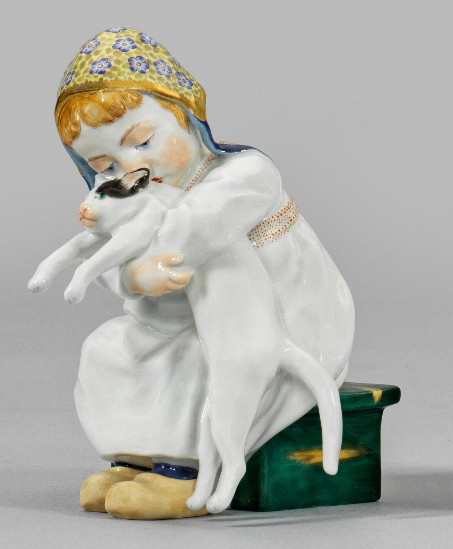 "Mädchen mit Katze" aus der Serie der sog. Hentschelkinder Auf einem Bänkchen sitzendes kleines Mädchen in weißem Kleid mit gepunktetem Latztuch und goldgesäumtem, blütengemustertem Käppchen, eine Katze liebkosend. Polychrome Aufglasurmalerei. Entw. Konrad Hentschel, 1905. Modell-Nr. 73367. Schwertermarke. H. 12 cm.