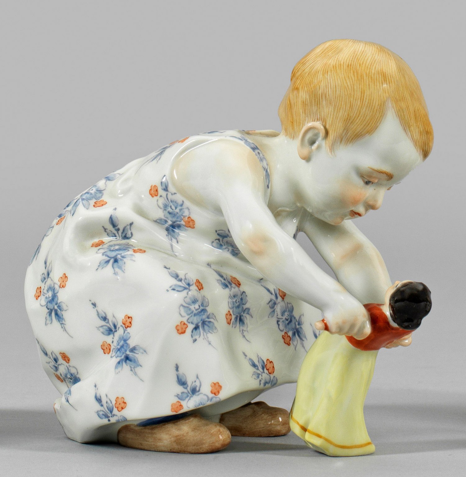 A porcelain figure of a child playing with a doll from the series "Hentschel children" modelled by K. Hentschel in 1904. Crossed swords mark.