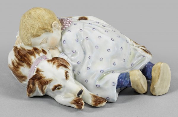 Auf dem Boden schlafendes Kleinkind in hellem, gepunktetem Kleid, blauen Strümpfen und hellbraunen Pantoffeln, den Kopf auf dem Rücken eines liegenden Hundes anlehnend. Naturalistische Ausformung. Polychrome Aufglasurmalerei. Entw. Konrad Hentschel, 1905. Modell-Nr. 73368. Schwertermarke. H. 8 cm.