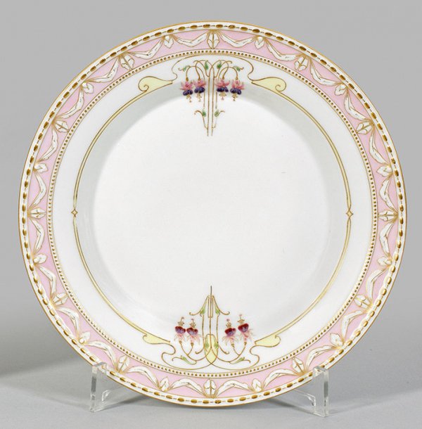 Jugendstil- Zierteller mit Dekor "Tränendes Herz" Runde, vertiefte Form. Reliefdekor "Kurland" auf rosafarbenem Fond. Übergehend vom Spiegel zur Fahne stilisierter, axialsymmetrisch angeordneter, feinliniger Floraldekor mit "Tränenden Herzen" aus farbigen Schmelzperlen und Reliefgoldlinien. Polychrome Aufglasur- und Emailmalerei. Goldstaffage. Maler-Nr. 73 für Karl Haube. Gold minim. ber.; Zepter- und Malereimarke. D. 25 cm.