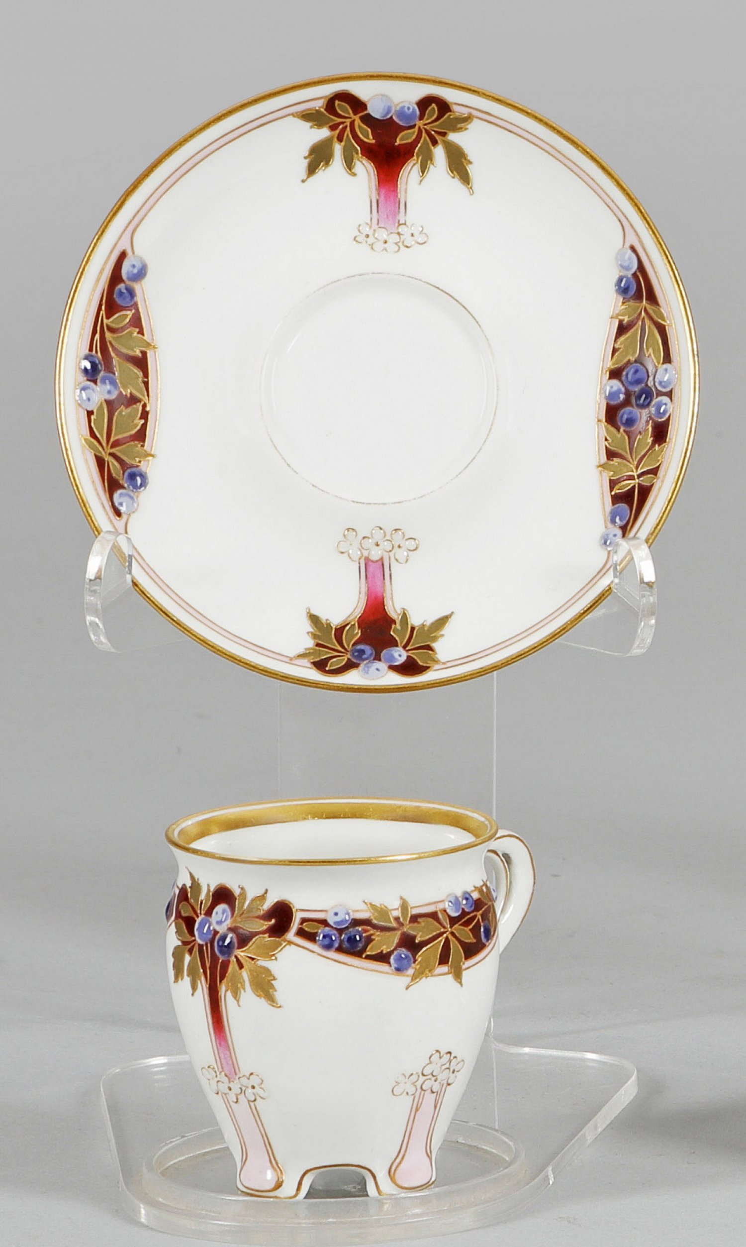 Jugendstil-Mokkatasse mit Untertasse. Auf vierfach eingezogenem Stand glockenbecherförmiger Korpus mit geschwungenem Henkel. Auf der Wandung und im Spiegel axialsymmetrischer, stilisierter Dekor. Feinlinig, in Reliefgold konturierte Beerenzweige und Vergissmeinnicht-Blüten aus blaufarbenen und farblosen Emailperlen mit grünen, mattvergoldeten Blättern sowie rosa- und bordeauxfarbenen Fondflächen. Polychrome Aufglasur- und Emailmalerei mit Goldstaffage. Dekor-Entw. Richard Fuhry, um 1902. Zepter- und Malereimarke. H. 5,5 cm.
