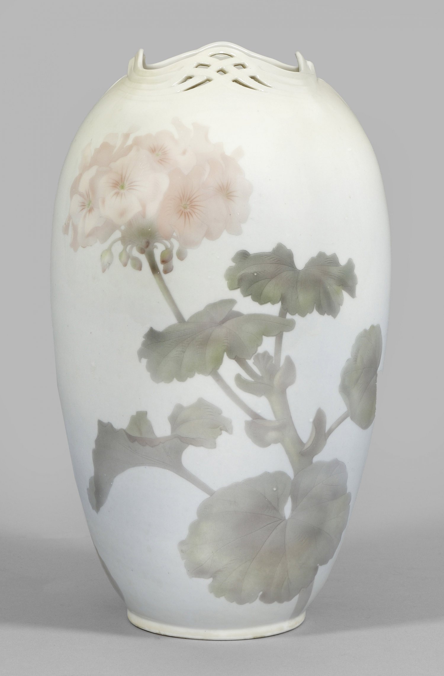 Jugendstil-Vase mit unterglasurfarbenem Geraniendekor Gestreckt-ovoider, zur Schulter gerundeter Korpus mit wellenbandartigem, durchbrochen gearbeitetem Rand. Auf der Wandung großflächige Darstellung von blühenden Geranien mit umlaufendem Rankenwerk. Pastelltonige Unterglasurmalerei in Rosé-, Grün- und Grautönen. Undeutliche Entw.-Bez., wohl Arthur Kloepel (ab 1891 bei der KPM tätig). Modell-Nr. 2313. Bez. "29 I" in Unterglasurbraun. Rest.; Riss. Zeptermarke. H. 35 cm.