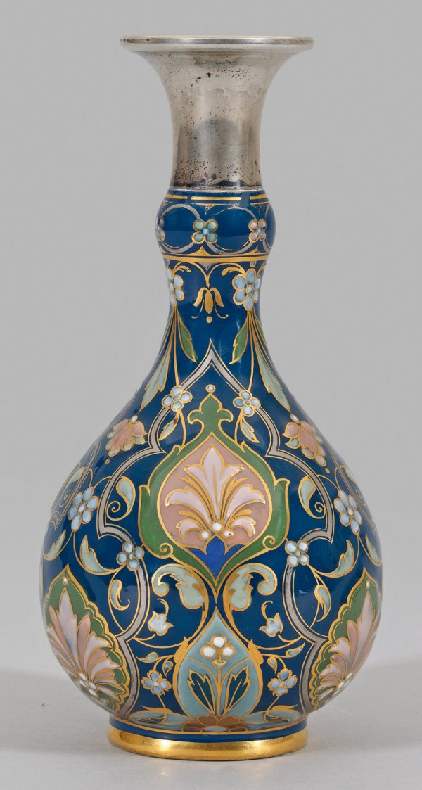 Kleine Jugendstil-Vase mit Pâte-sur-pâte-Malerei Bauchiger Korpus in schlanken Hals mit Nodus und sich konisch erweiternden Rand übergehend. Auf der Wandung in königsblauem Fond umlaufender fein reliefierter sog. Pâte-sur-pâte-Dekor aus arabesken stilisierten Blüten- und Blattranken mit Goldkonturierung wohl von Rudolf Hentschel. Silbermontierung Gest. 800 W. Schwechten Berlin. Schwertermarke. H. 17 cm.