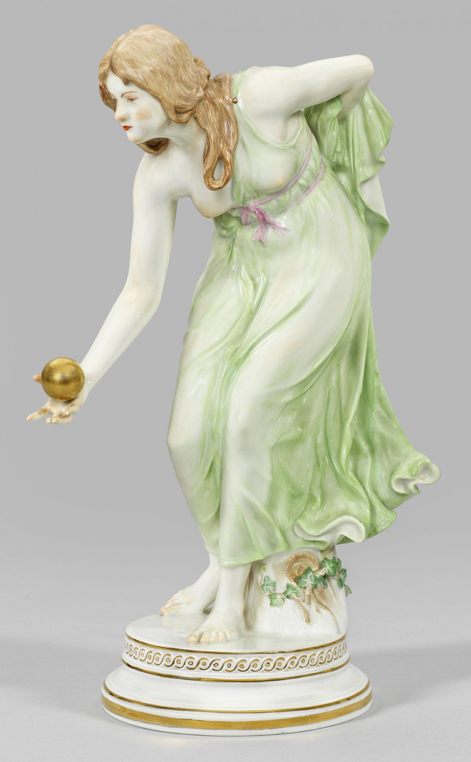 "Kugelspielerin". Originaltitel Auf rundem Sockel mit Flechtbandbordüre gebeugt stehendes Mädchen in langem, lindgrünem Kleid, in ihrer Hand eine goldene Kugel zum Wurf haltend. Polychrome Malerei mit Gold. Entw. Walter Schott, 1897. Modell-Nr. Q 180. Minim. rep./rest.; Schwertermarke. H. 38 cm.