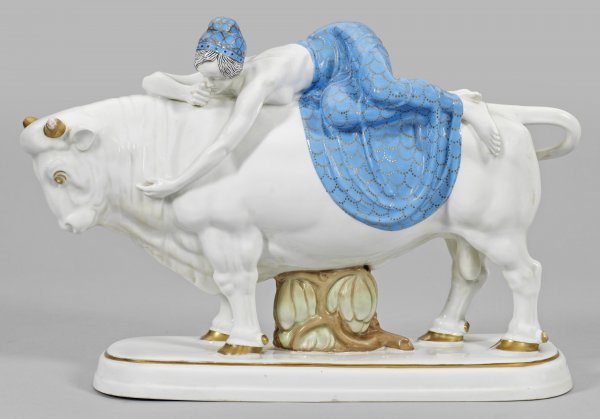 Große Figur "Europa auf dem Stier". Originaltitel Auf ovalem, profiliertem Sockel stehender, kraftvoll anmutender Stier über stilisierter Stütze aus Blatt- und Astwerk. Auf seinem Rücken liegende Europa mit entblöstem Oberkörper, bekleidet mit einem hellblauen, goldgemusterten Rock. Das dunkel angedeutete Haar ist von einer gleichfarbenen, blauen Kappe bedeckt. Die rechte Hand ans Kinn geführt, die Linke berührt den Stier am Hals. Polychrome Malerei mit Goldstaffage. Entw. Carl Nacke, um 1915. Entw.-Bez.; Gold minim. ber.; Manufakturmarke. H. 33,5 cm. 49 cm x 15 cm.