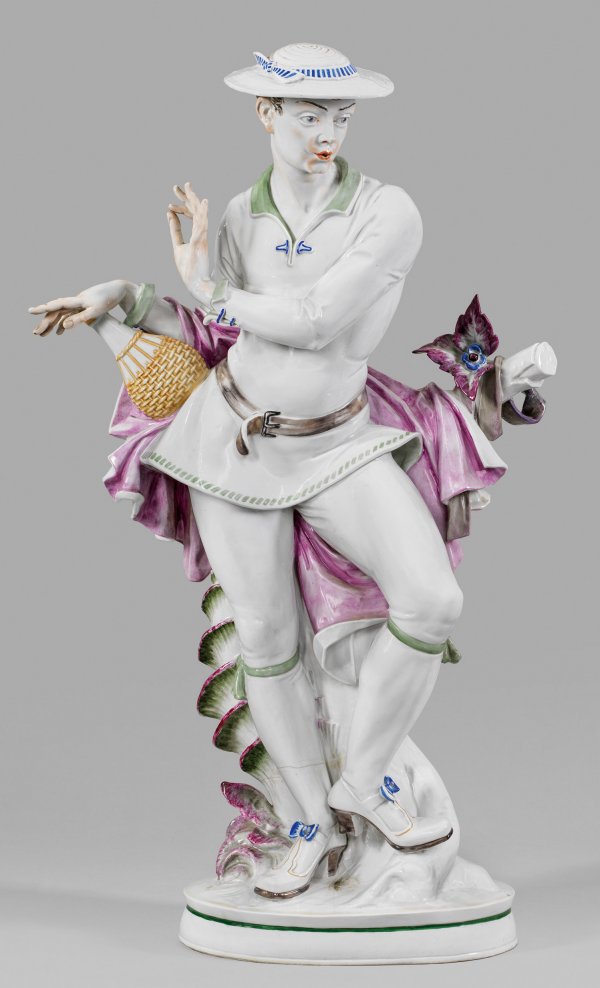 Monumentale Figur "Pfeifer". Originaltitel Auf ovalem Sockel im Kontrapost stehender, pfeifender Jüngling mit Hut. In der rechten Hand eine Weinflasche haltend. Die erhobene Linke in gezierter Geste. Polychrome Aufglasurmalerei. Entw. Hugo Meisel. Entw.-Monogr und Dat. (19)22. Haarrisse. Manufakturmarke. H. 77 cm.