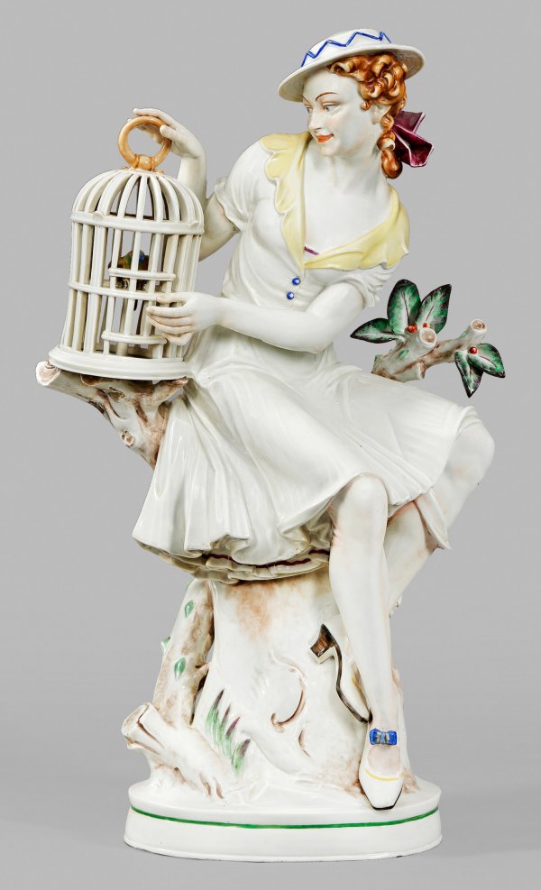 Monumentale Figur "Mädchen mit Vogelkäfig". Originaltitel Ovaler Sockel. Auf einem Baumstamm sitzendes junges Mädchen im knielangen, tief dekolletierten Kleid. Das gelockte, braune Haar ist von einem Hut bedeckt. Mit beiden Händen einen Vogelkäfig haltend und dem darin sitzenden Vogel die Tür öffnend. Polychrome Aufglasurmalerei in kräftigen Farben. Entw. Hugo Meisel. Entw.-Monogr. und Dat. (19)22. Minim. rest./best.; Manufakturmarke. H. 75 cm.